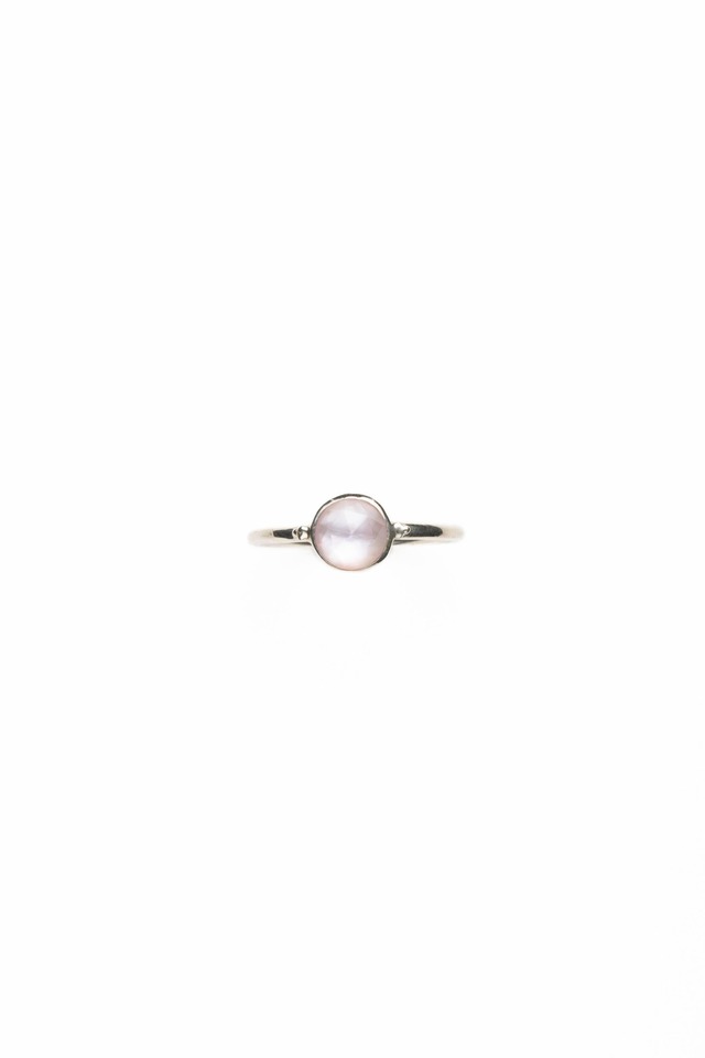 両サイドに三つのドットがあしらわれたピンクアメジストのリング。 白蝶貝と柔らかいピンクのアメジストを張り合わせた天然石を華奢な枠で囲ったデザインです。 華奢なデザインながら、さりげなく美しい手元を演出してくれます。 素材 SV925、白蝶貝、アメジスト サイズ 10号