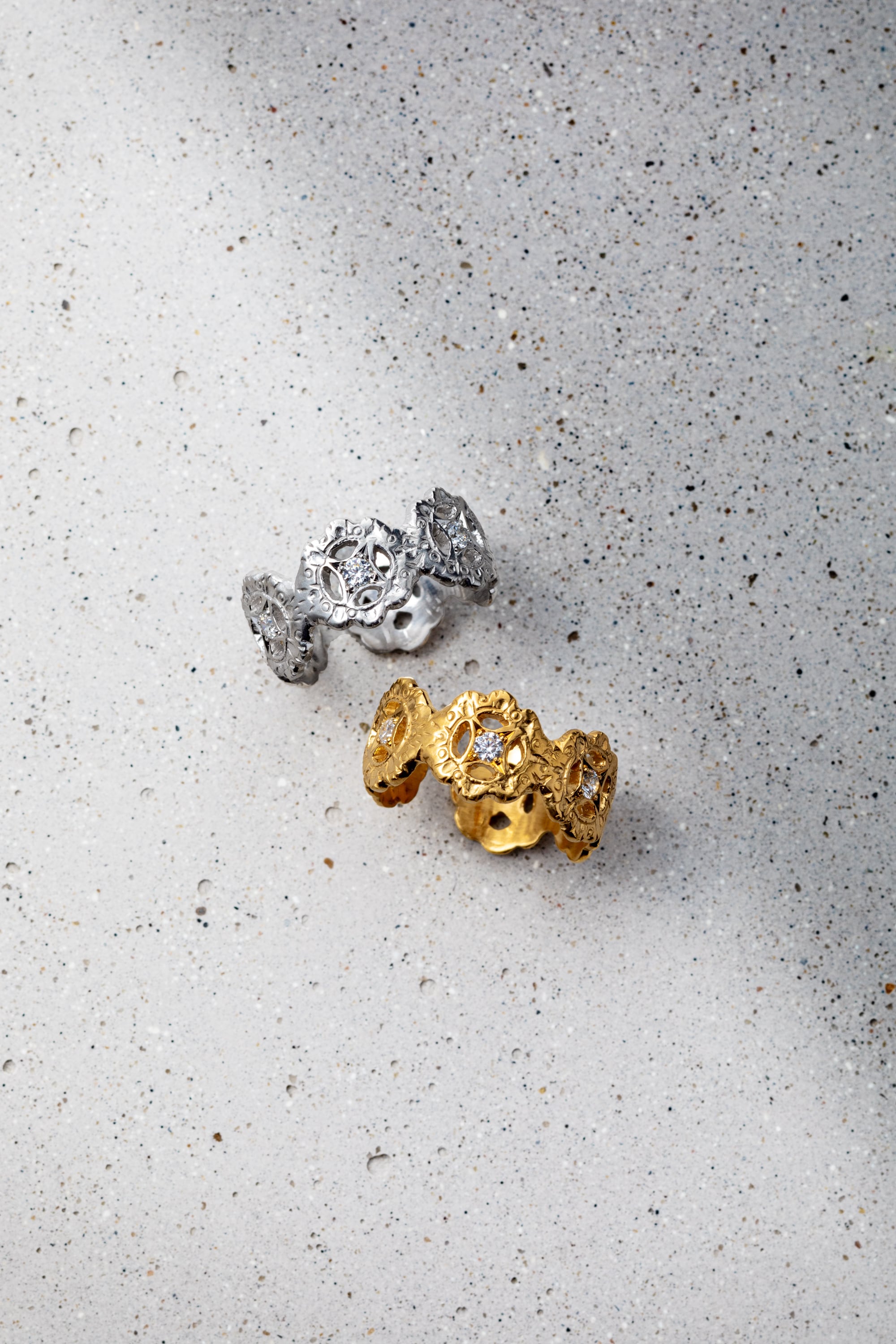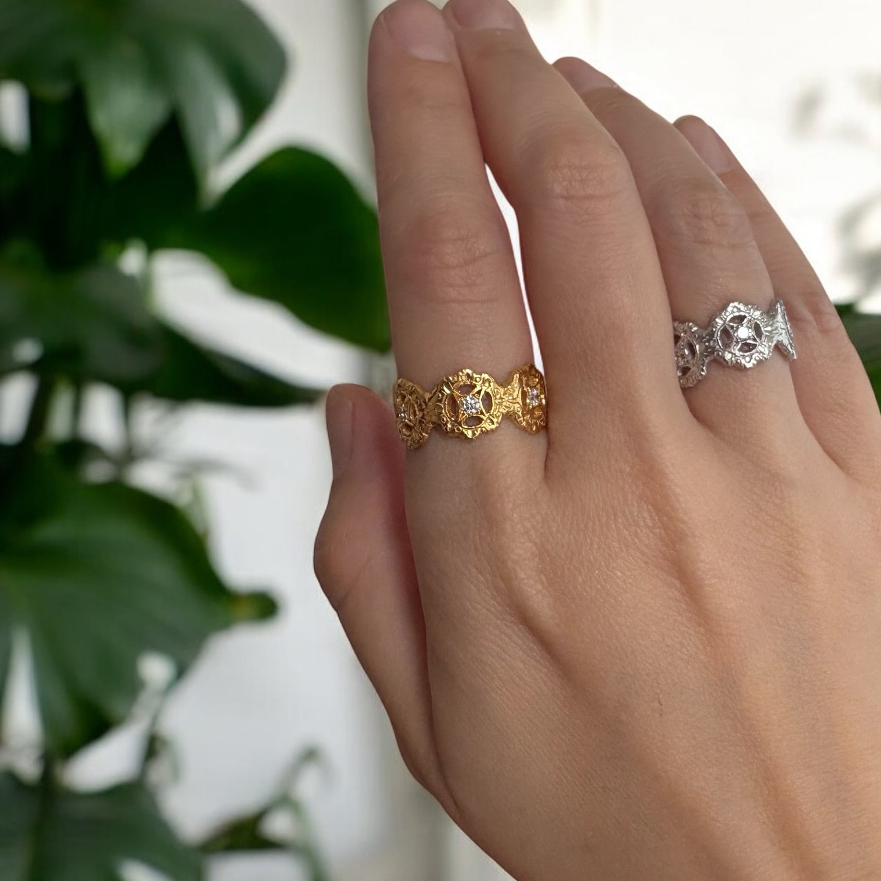 イタリアのフィレンツェ彫りを施した華やかなシルバーのフラワーリングに、ジルコニアを6石セッティグしたデザインです。彫りの輝きが指先を華やかに演出します。